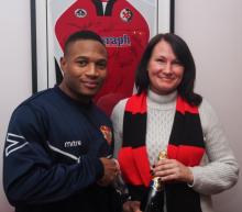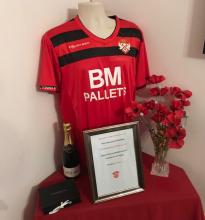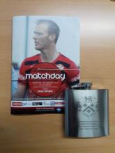 We were soon back in the lounge, continuing to imbibe, and waiting for the player we had nominated as Man of the Match to come and see us, to get a bottle of Champagne and present us with a memento of the day in the form of a specially engraved hip flask. Unfortunately, by the time the player, goalscorer Aaron O'Connor joined us, after a protracted team-rollicking from our furious Manager, half of the sponsors had left. Those of us who remained pushed our Stores person, Eve forward to do the honours (much to her horror!)
